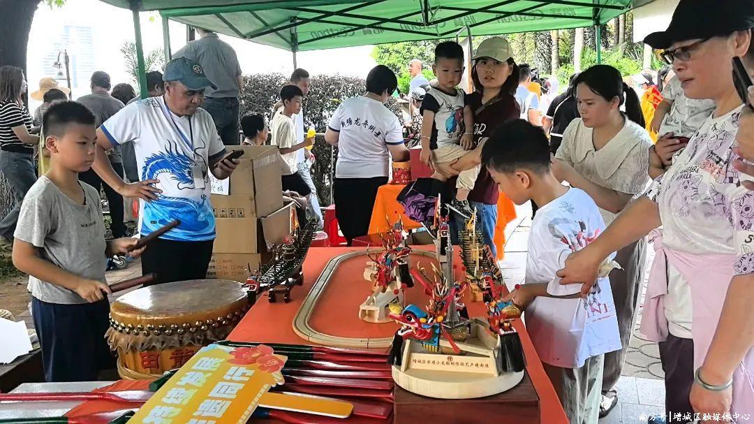 在这里,市民、游客不仅能观赏到新塘龙舟景的热闹盛况,还可亲手包制鱼包、体验剪纸、学习打龙舟鼓,在沉浸式互动中近距离感受非遗魅力,聆听传承人讲述非遗项目的文化内涵,近距离感受非遗,了解非遗。