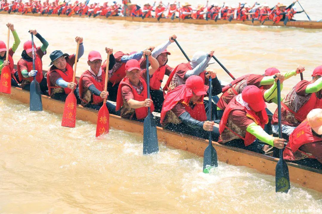 不少龙舟队即兴展开表演赛,在碧波中你追我赶,展现出力争上游的拼搏精神。尽管烈日当空,但龙舟健儿们依然斗志昂扬,每一次划桨都充满力量,每一次转弯都精准有力。